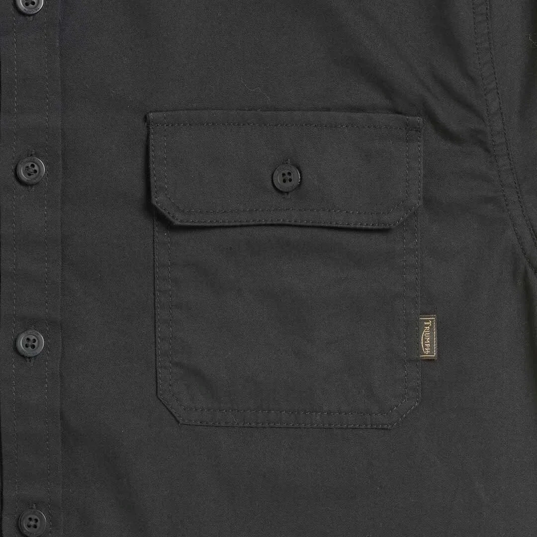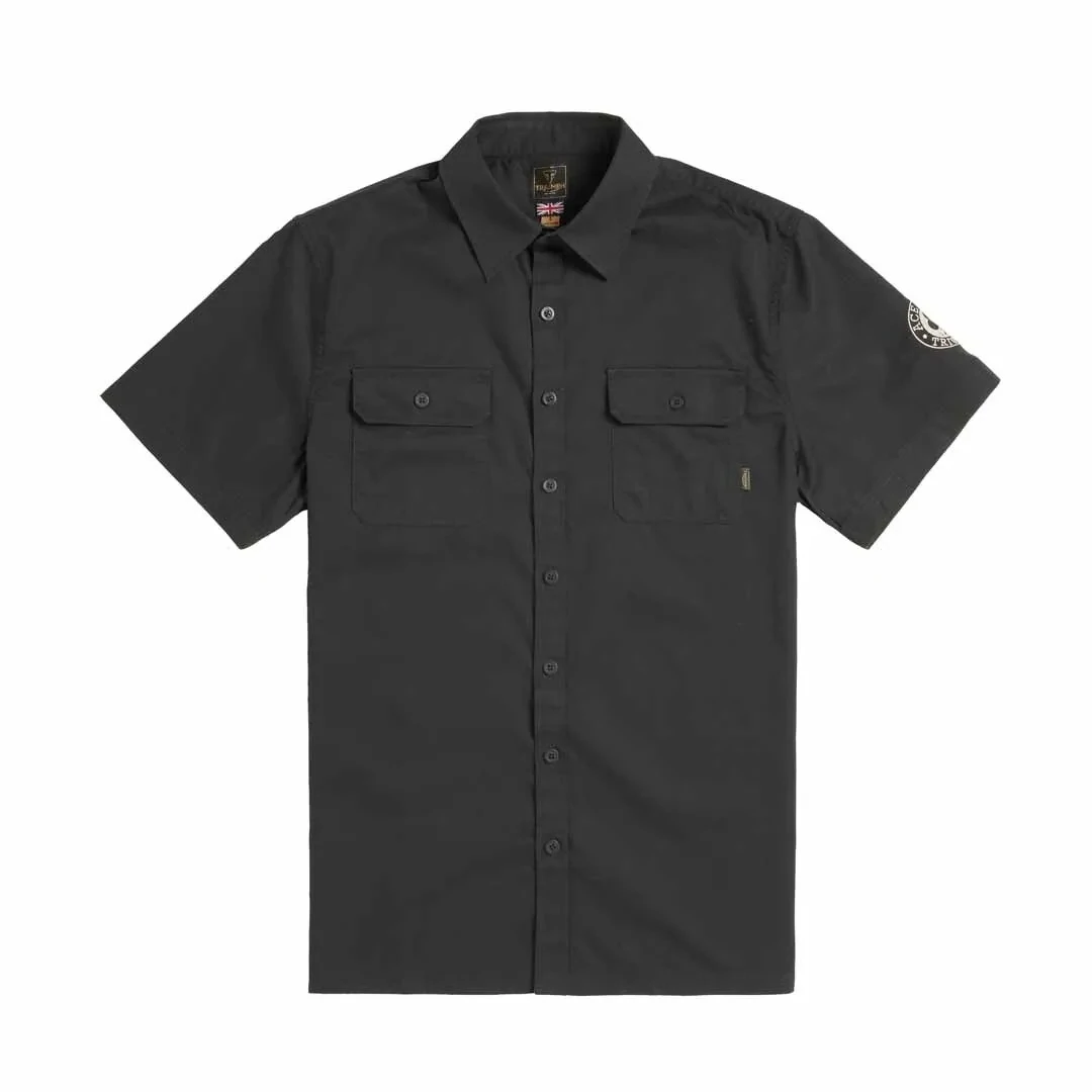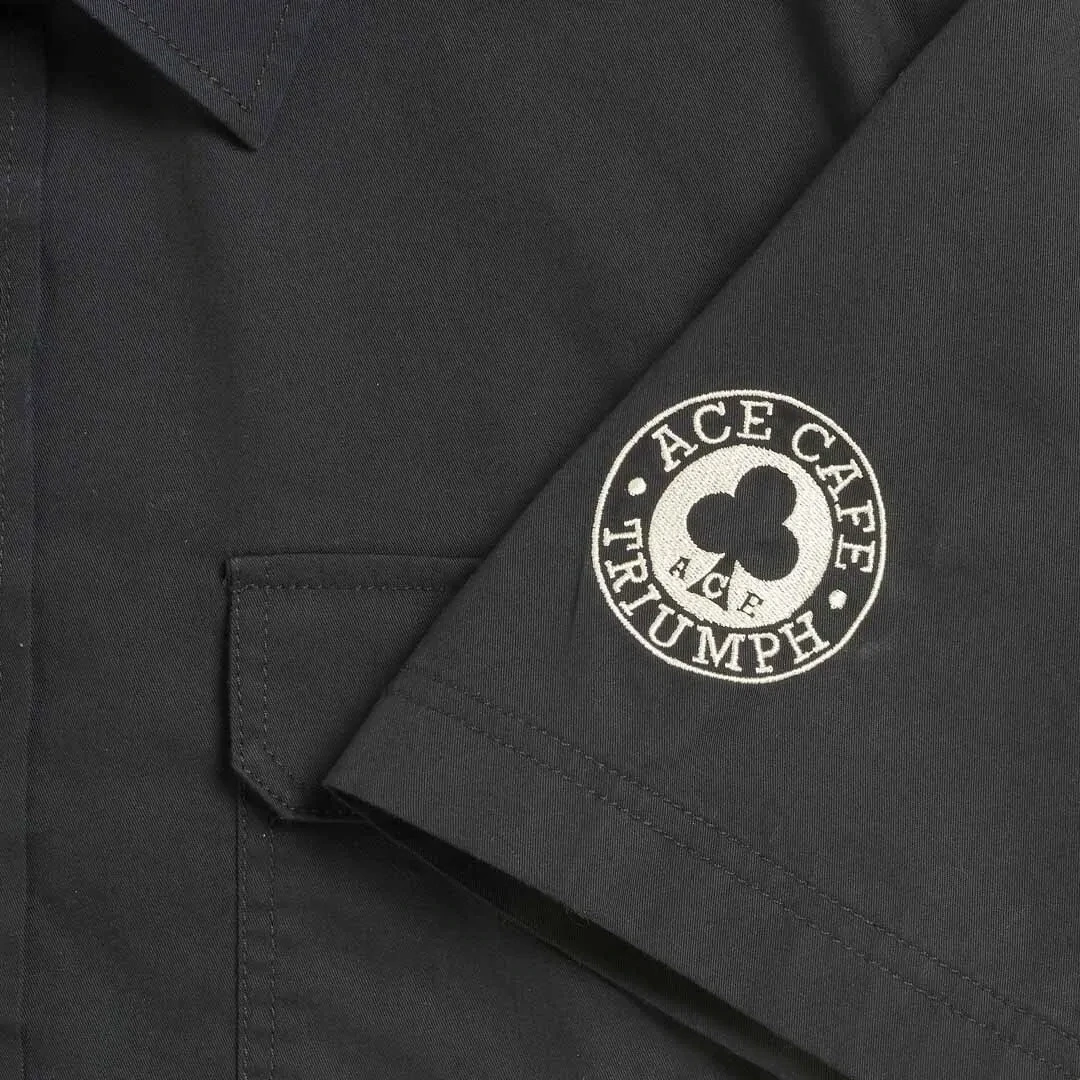 A camisa preta bordada Triumph é uma camisa preta de manga curta 100% algodão, com bolsos no peito, com fecho de botão, estilo de botão com logotipo Triumph X Ace Cafe bordado personalizado na manga esquerda e logotipo maior nas costas.