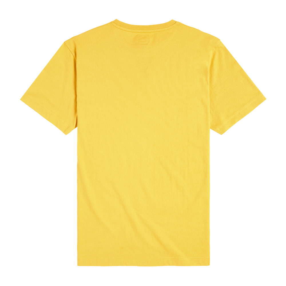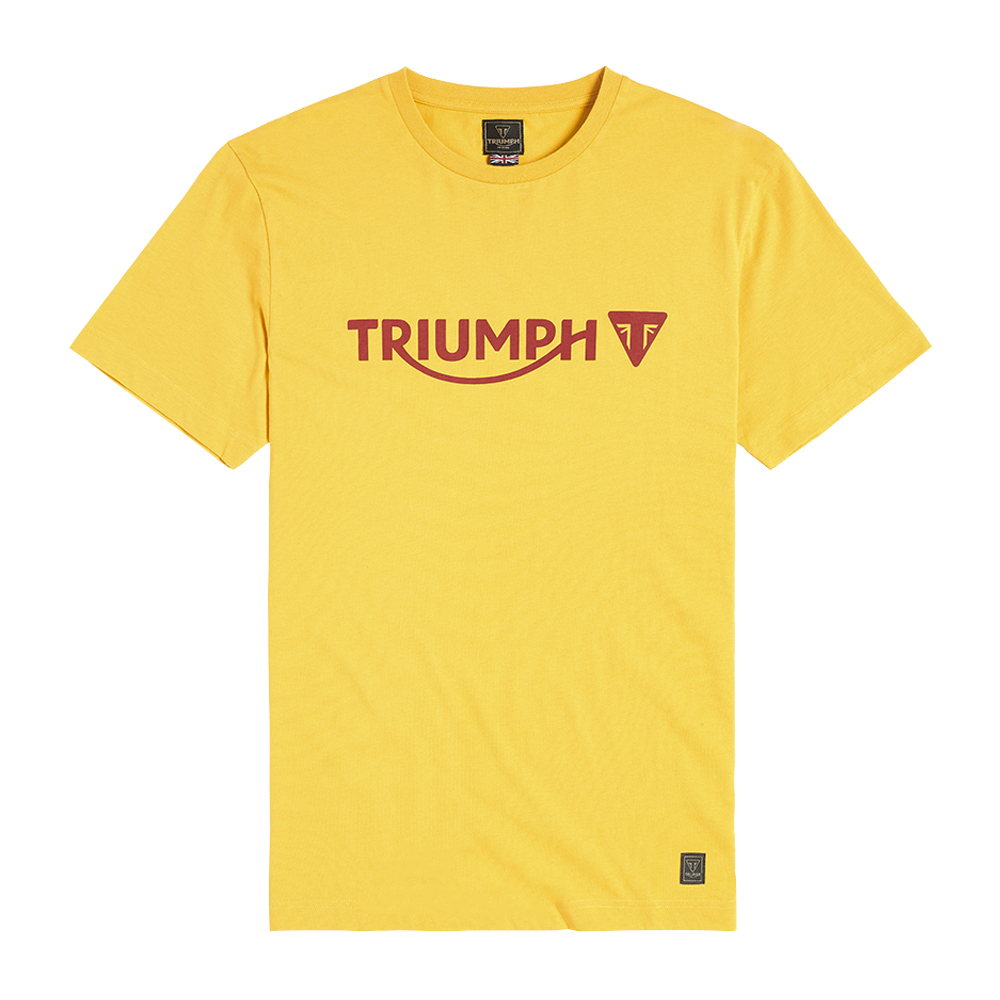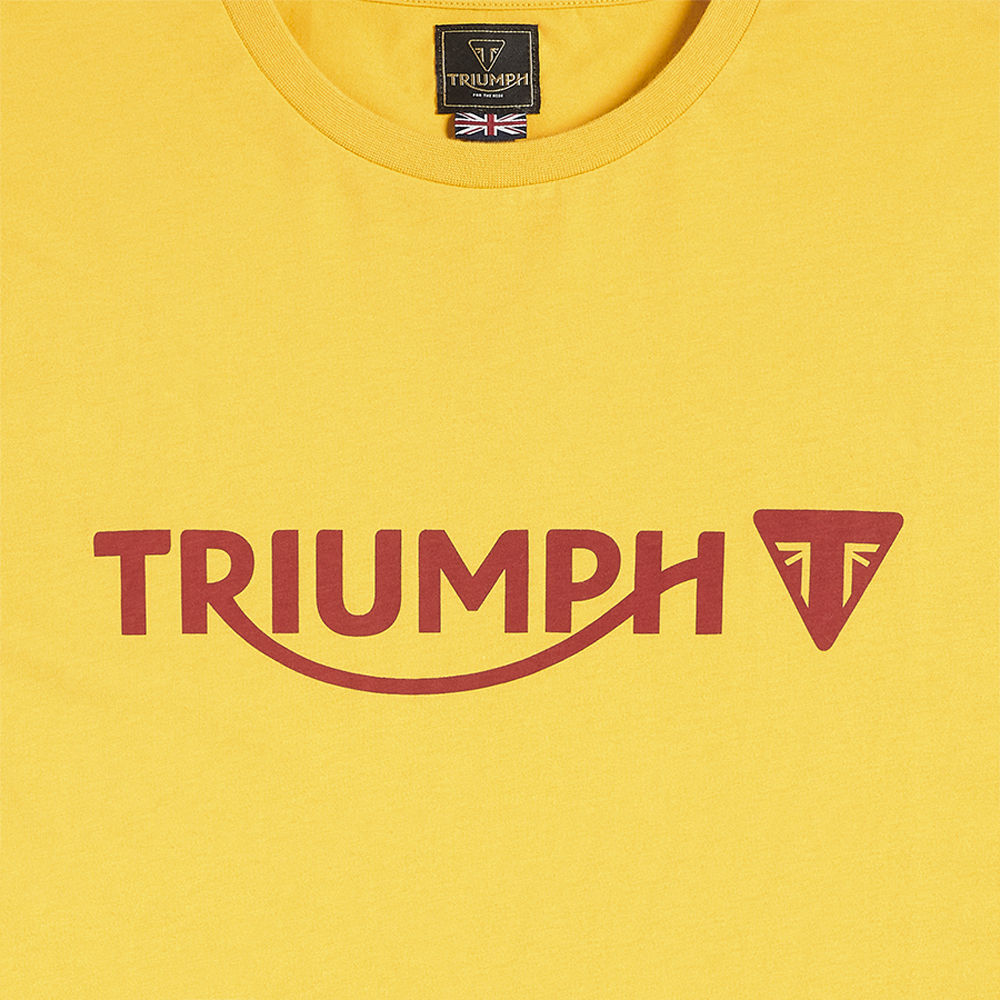 Uma camiseta clássica 100% algodão de 160 g/m² em ouro com um logotipo Triumph levemente pigmentado em vermelhão no peito.
