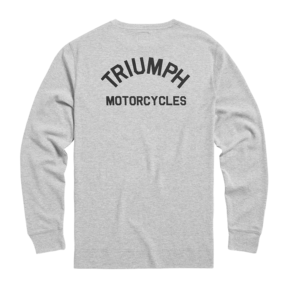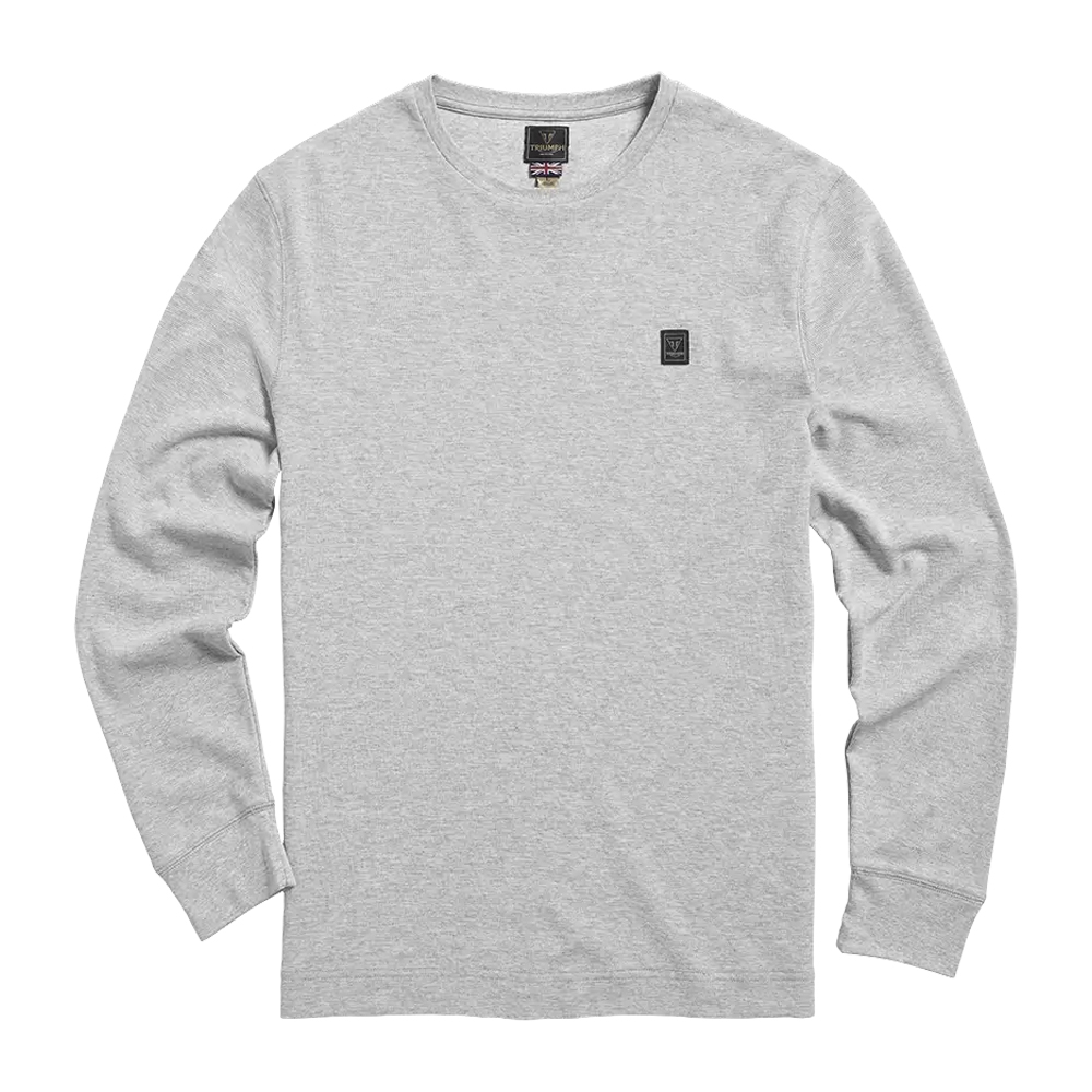 Uma camiseta de algodão com textura waffle de manga longa em cinza Marl, com o emblema da Triumph costurado no lado esquerdo do peito e o logotipo arqueado da Triumph Motorcycles impresso em preto nas costas.