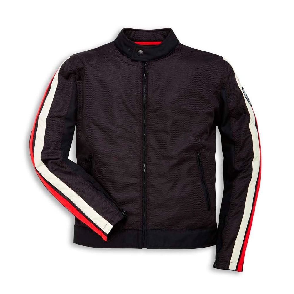 A jaqueta Breeze, projetada por Aldo Drudi exclusivamente pra Ducati, é uma peça que combina uma fabricação contemporânea a um design clássico. Disponível seja em versão masculina ou feminina, é inspirada na marca que entre 1954 e 1968 era utilizado pela unidade de negócios “Mecânica” que cuidava da produção das motos. A jaqueta, preparada para a inserção de protetores de coluna, é equipada com proteções removíveis nos ombros e cotovelos e de um forro contra-vento resistente à água. Simplesmente perfeita para o verão graças ao tecido perfurado com o qual é produzida.