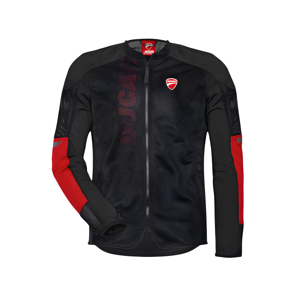 Estilo masculino com branding Ducati e inserções vermelhas de alto contraste