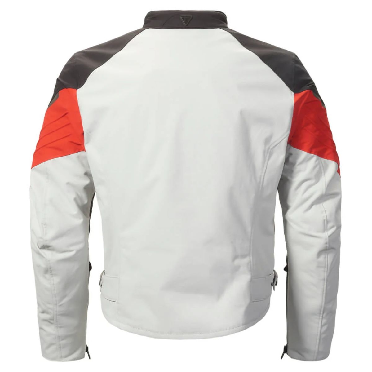 O esquema de cores exclusivo da jaqueta apresenta um impressionante peito, parte interna do braço e painéis dos ombros pretos, lindamente complementados por detalhes em vermelho ousado contra o tom cinza, destacando-o nas ruas. O tecido de cor clara não se resume apenas à aparência – ele vem equipado com um revestimento de Teflon, garantindo resistência à sujeira e fácil manutenção, especialmente ideal para ciclistas em climas mais quentes.
