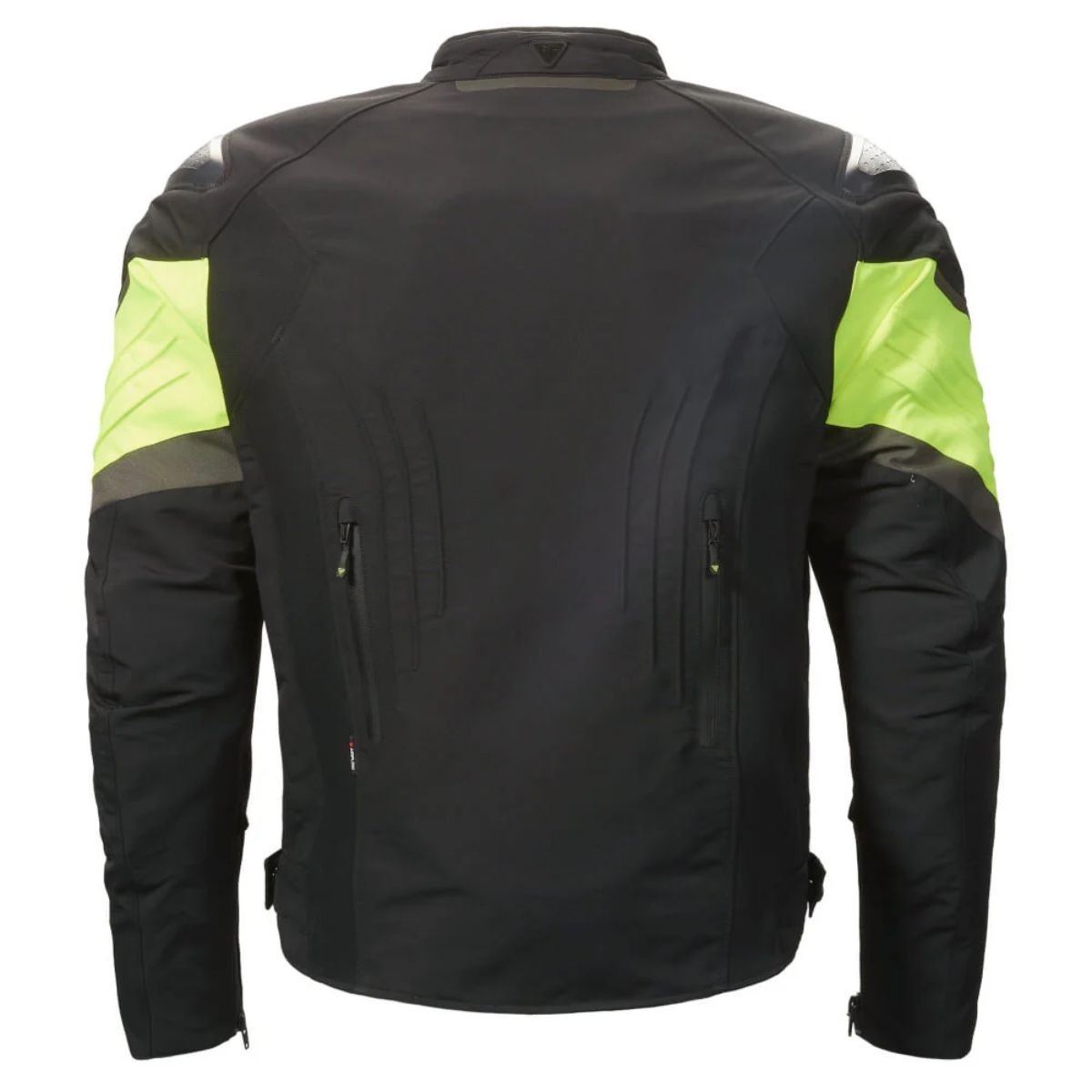 Esta jaqueta preta de motociclista com vibrantes detalhes fluro incorpora o estilo roadster, perfeita para conquistar ruas urbanas com estilo e funcionalidade.