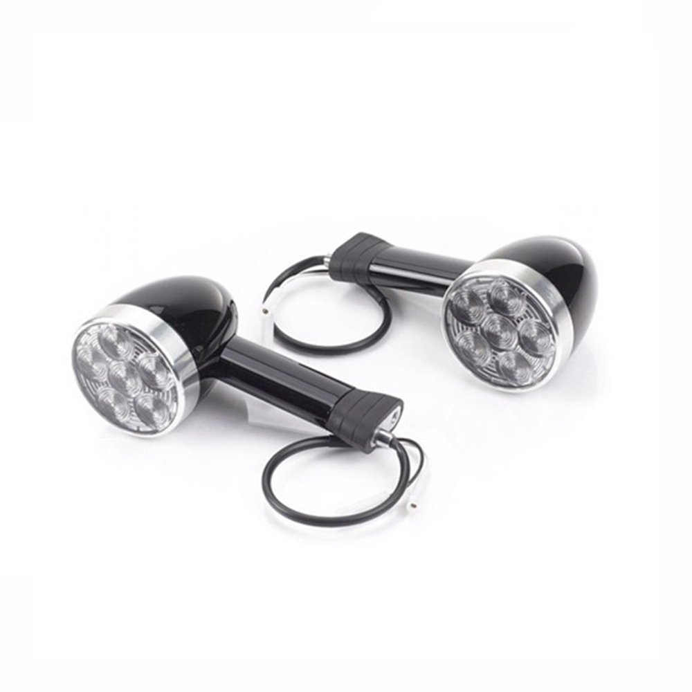 Um conjunto de indicadores LED frontais estilo bala com uma moldura de alumínio torneada, corpo preto brilhante e lente LED transparente. Homologado UE.
