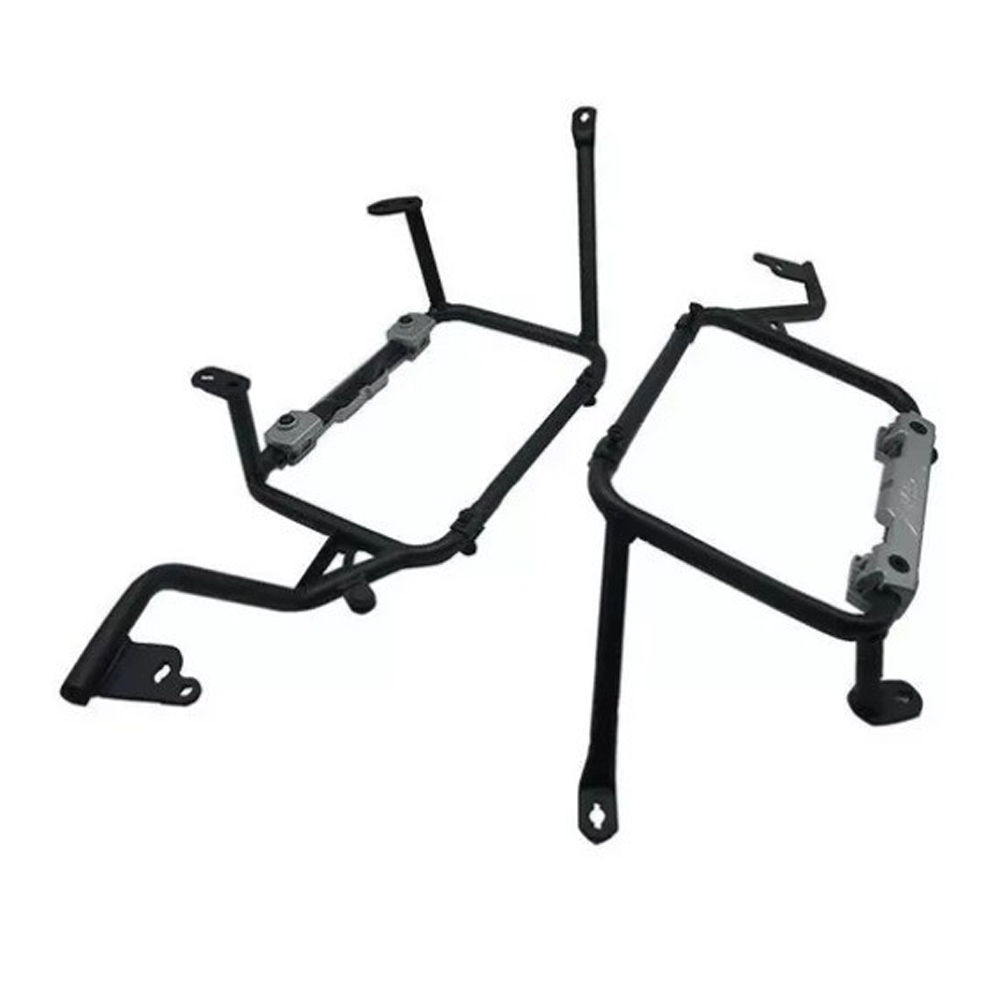 Suporte para Baú Lateral Fabricado com chapas 4,25mm com acabamento em pintura epóxi preto fosco. Preso à moto em pontos de fixação já existentes, não sendo necessário qualquer modificação nas características originais da moto. Não permite que o baú vibre, mantendo sua bagagem segura por toda sua viagem.